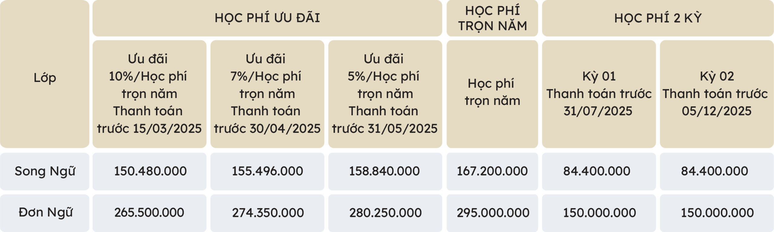 BẢNG BIỂU HỌC PHÍ CHUNGMức học phí chung cho năm học 2025-2026 (Đơn vị: VND)Lưu ý:Các khoản mục bao gồm trong học phí trên không áp dụng cho học sinh tham gia chương trình gói tài chính và chương trình học bổngBiểu phí trên đã bao gồm đồng phụcXem bảng biểu học phí chi tiết tại đâyHọc phí chi tiết